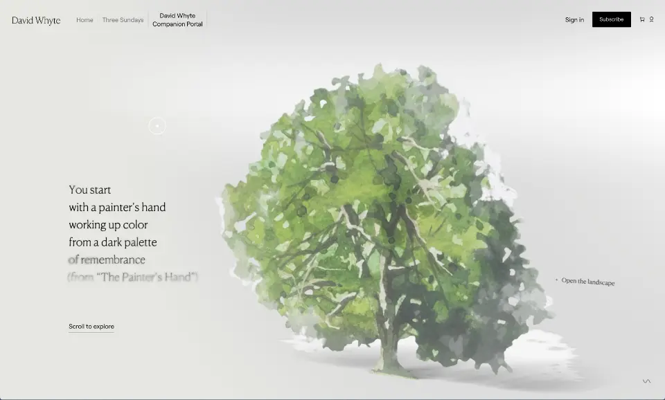 The opening watercolor experience that introduces David Whyte's online Companion Portal.