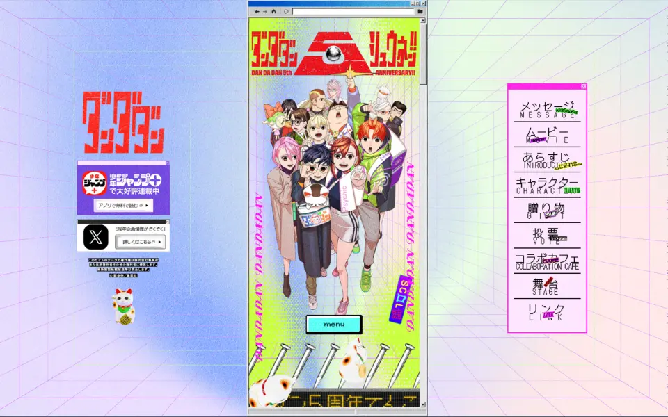 『ダンダダン』5周年記念特設サイト。キャラクターの新情報や伊藤潤二先生によるコラボイラスト、ベストエピソード投票など、周年企画がてんこ盛り!※スクロールのしすぎにはご注意ください。